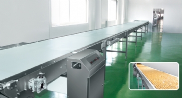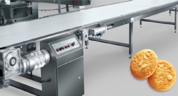冷却输送机是饼干生产线的辅助设备,用于饼干烘烤后的冷却输送。能使饼干在呈柔软状态平稳输送,降低饼干温度和使其水份蒸发与平衡。