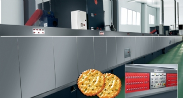 该炉由炉体、网带传动系统、热风循环系统、排潮系统、网带纠偏系统、热源及电控系统组成。以电作为烘烤能源,采用远红外石英电热管,能效高,寿命长,维护简便。各温区独立热风系统,以提高热效率,加热快,节能,环保,烘烤的饼干口感好,色泽均匀美观。