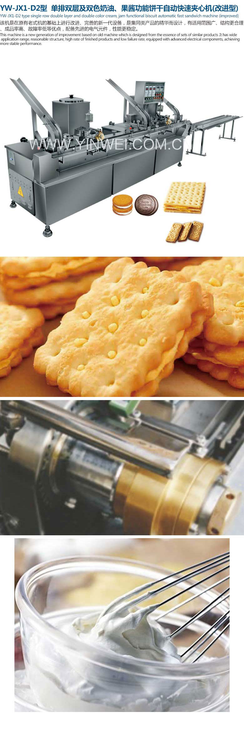 ②光电控制,自动检测缺饼,停机自动关闭给料器,确保不漏馅料,使机器干净; ③联操调速,操作更方便; ④定形链条送饼,生产效率及成品率高; ⑤星轮整理饼干,使饼干排列有序; ⑥星轮转子泵取代传统的齿轮泵供料,提高每块饼干的夹心馅料均匀度,且长时间使用不塞泵; ⑦夹心多样化,适合果酱、奶油,双层及双色夹心(3枚饼干加两层夹心或2枚饼干加一层夹心)。 ⑧夹心馅料形状多样变化,料量调节方便; ⑨自动温度控制,保证夹心馅料恒温; ⑩长、方、圆、椭圆,各种规格的夹心饼干转换品种时,各部位调节快速、方便; 整机主要使用不锈钢制造,外形新颖,符合食品卫生要求。 |