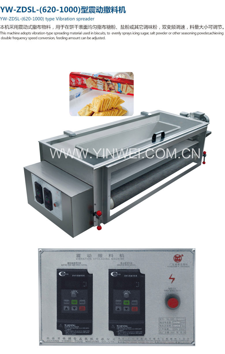 本机采用震动式撒布物料,用于在饼干表面均匀撒布糖粉、盐粉或其它调味粉,双变频调速,料量大小可调节。