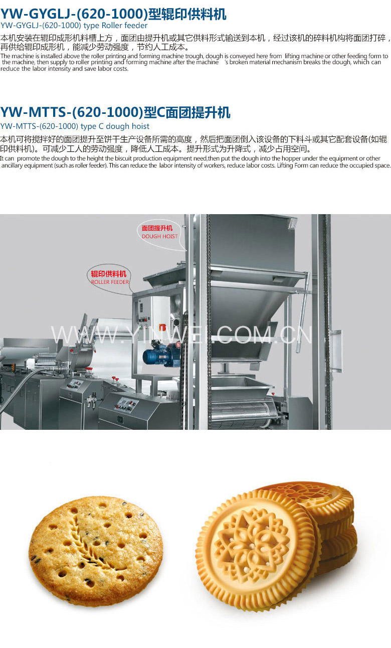 面团提升机可将搅拌好的面团提升至饼干生产设备所需的高度,然后把面团倒入该设备的下料斗或其它配套设备(如辊印供料机)。可减少工人的劳动强度,降低人工成本。提升形式为升降式,减少占用空间。