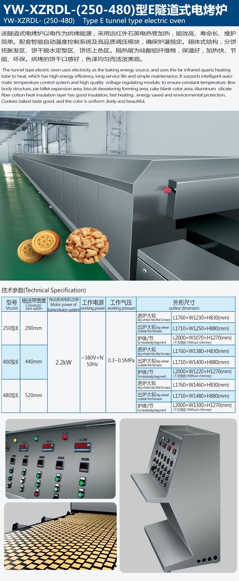 该隧道式电烤炉以电作为烘烤能源,采用远红外石英电热管加热,能效高、寿命长、维护