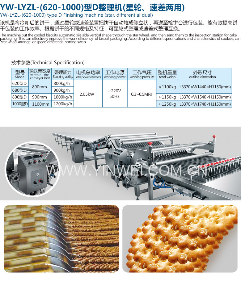 ②Use the ring PU belt, is equipped with a separating knife and waste tank, easy to clean. ③Pneumatic type automatic tensioning, automatic correction of conveying belt, high degree of automation, simple operation. ④Star stainless Richard bread wheel, can be up and down, before and after the adjustment, to adapt to different specifications of biscuits. ⑤The configuration of magnetic type cake separated, can quickly adjust the width, special structural design, adapt to the thin and different shapes and sizes of biscuits. ⑥Easy disassembly, easy to swap the star wheel speed difference and function, convenient and quick. |
