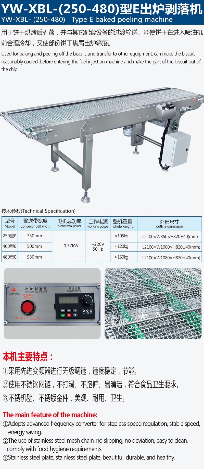 ①Adopts advanced frequency converter for stepless speed regulation, stable speed, energy saving. ②The use of stainless steel mesh chain, no slipping, no deviation, easy to clean, comply with food hygiene requirements. ③Stainless steel plate, stainless steel plate, beautiful, durable, and healthy. |