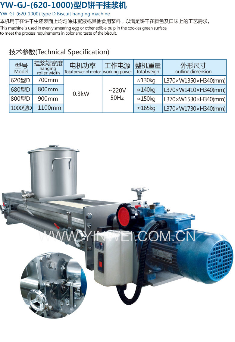 This machine is used in evenly smearing egg or other edible pulp in the cookies green surface, to meet the process requirements in color and taste of the biscuit.