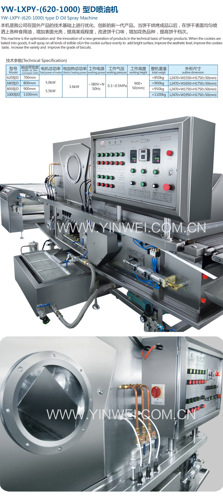 ②The oil tank is a double-layer structure, and can prevent oil produce miscellaneous taste and metamorphism. ③The butterfly oil thrower is used , can independently control the oil amount adjustment. ④With the self suction oil fume recovery device, clean environment, save oil. ⑤With pneumatic automatic correction of conveying belt, high degree of automation. ⑥use of stainless steel mesh belt conveyor, long service life, in line with food hygiene requirements, easy to clean. ⑦The machine is mainly made of stainless steel,of beautiful appearance and sanitation. ⑧Special structural design, and reduce the hygienic dead angle, as well ad prevent the oil drop phenomenon. |