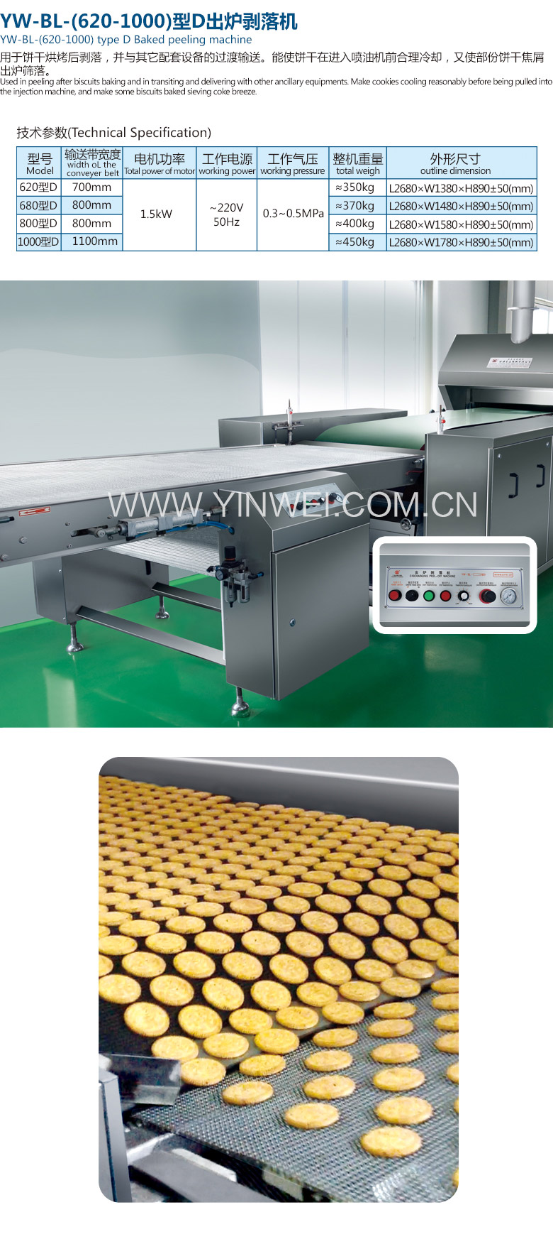②Pneumatic automatic slack, automatic correction of conveying belt, high degree of automation. ③The use of stainless steel mesh belt, easy to clean, complying with food hygiene requirements. ④Stainless machine wall, stainless sheet metal parts, of beautiful appearance and sanitation. |